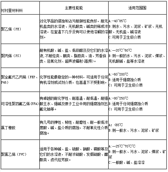3.3、傳感器襯里的選擇(見表l)